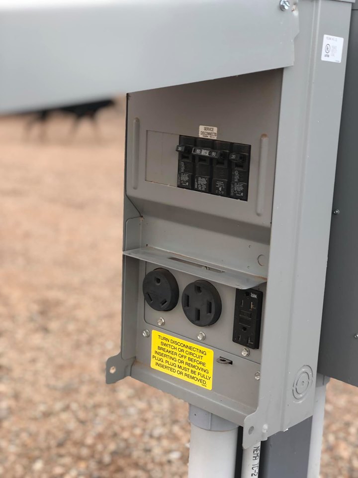 All of our spots are pull through spaces, roughly 120 ft long, and are full hook-ups with 20/30/50 amp connections, water hookups and sewer.